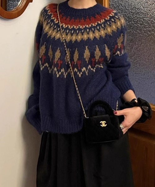 【お気に入り1,800人突破!】温もりあふれるノルディック柄♡シーズンムード満点の秋服・冬服あたたかみのある配色が映え♪着るだけで冬らしさを感じられる一着ゆったりとしたシルエットでリラックス感がありながらも、程よいボリューム感でバランスよく着こなせる◎■Point✔ 毛足のあるふんわり素材で包み込まれるような暖かさ♡✔ 冬ムードを高めるノルディック柄がコーデの主役に✔ ゆるっとしたシルエットで抜け感とリラクシーさを演出◎✔ 程よく厚みのあるニットでアウターインももたつきにくい♪✔ シンプルなボトムと合わせるだけでおしゃれ見えが叶う■Detail・ふんわり毛足の長いニット糸を使用し柔らかで軽い着心地・首元はリブ仕様のクルーネックで程よくフィット!・肩を落としたドロップショルダーでゆったりシルエット・ジャガード織りのノルディック柄が存在感をプラス♪・ヒップにかかるやや長め丈でバランス良く着こなせる……………………☑ 生地感:厚手(秋冬向け)☑ 伸縮性:あり☑ 透け感:なし☑ 裏地:なし……………………■Coordinate・デニム+ローファーで抜け感ある大人カジュアルに♪・ロングスカート+ブーツでフェミニンな冬スタイル・スラックスと合わせてきれいめMIXコーデに☆・ショートパンツ+タイツで韓国っぽいバランスに・アウターはダウンやチェスターコートを羽織っても◎■Recommended For・秋冬らしい柄ニットをお探しの方・ふんわり素材で暖かく、着心地も重視したい方・カジュアルにもガーリーにも着回したい方・デイリーコーデに季節感をプラスしたい方※モニター・環境により実際の商品と多少色味が異なって表示がされる場合がございます。予めご了承をお願いいたします。製品には問題ございません。※画像の商品はサンプルとなります。実際の商品と色味、仕様、加工、サイズ、素材等が若干異なる場合がございます。【末永くご愛用いただく為に】アテンションタグ・洗濯ネームタグを必ずご確認の上、ご着用又はお取り扱い下さい。【mejane】世界中を旅する女性をイメージしたトラベルストーリーナチュラルでリュクス、マテリアルなのに何処かトレンドを感じさせる..大人カジュアルスタイルをご提案していきます。 TPOに合わせ 一着が多様に変化するスタイリングを楽しんでいただけるITEMを取り揃えてお待ちしております。【お買いものをお楽しみいただく為に】▼mejaneの商品をお気に入りに登録♡をクリック!完売カラーの再入荷通知や、ラスト1点の通知、セールの通知をお知らせします。▼mejaneをお気に入りブランドに登録新商品や再入荷など、いち早くお得な情報を受け取ることができます。