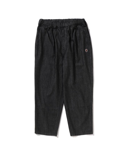 左腿部分にAPE HEADのワンポイントワッペンをあしらった伸縮性のあるデニムパンツ。イージーウエスト仕様でドローコードがついており、サイズ調整が可能。