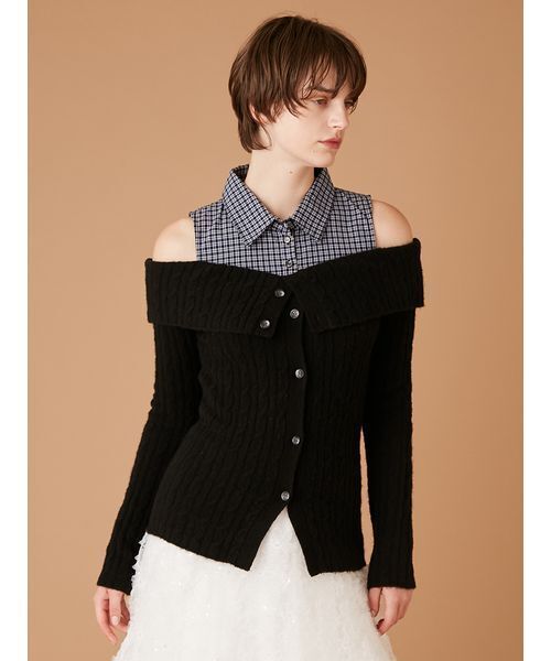 ノースリーブのシャツがレイヤードされたオフショルダーのニットプルオーバー。ふんわりと起毛した質感の糸を使用し、ケーブルで編みたてました。シャツをドッキングすることで着崩れせず、一枚で様になるレイヤード風デザインです。程よい肌見せが大人感を漂わせます。透け感;なし裏地;なし伸縮性;あり光沢感;なし生地の厚さ;やや厚手※照明の関係により、実際よりも色味が違って見える場合があります。またパソコン・スマートフォンなどの環境により、若干製品と画像のカラーが異なる場合もございます。予めご了承ください。商品の色味は、商品単品画像をご参照下さい。 ※商品画像はサンプルのため、色味やサイズ等の仕様に変更がある場合がございますので、予めご了承ください。