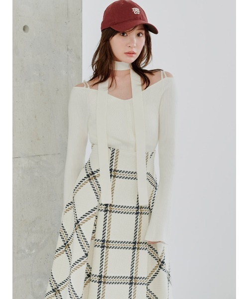 【デコルテラインが美しい!ニットタイがセットの上品ニットプルオーバー】【Design/Styling】同素材のニットタイがセットになった上品ニットプルオーバーです。大きくデコルテを開けたフィット感のあるデザインで、伸縮性・立体感のあるリブ編みで仕上げているので、ボディラインを美しく演出します。胸元はビスチェ風に見えるように、リブで柄を入れているのもポイント。フロントのボタンは飾りで開かないデザインです。裾は大きくスリットを入れてメリハリを出しており、アウトで着用したときにスタイルアップ効果も抜群に。大きく開いた襟ぐりの肩には、華奢な2本のストラップを付けているので、オフショル風にもご着用いただけます。袖はベルスリーブで裾口を広げているので1枚で着てもサマ見えするデザインです。ファブリックイレヘムフレアスカート(SWFS254268)とのセットアップコーディネートがおすすめです。【Fabric】アイボリー、ブラック、ブラウン、ライトブルーの4色展開です。透け感;なし裏地;なし伸縮性;あり光沢感;なし生地の厚さ;普通【おすすめ骨格タイプ】■骨格ストレート■骨格ウェーブ■骨格ナチュラル※照明の関係により、実際よりも色味が違って見える場合があります。またパソコン・スマートフォンなどの環境により、若干製品と画像のカラーが異なる場合もございます。予めご了承ください。商品の色味は、商品単品画像をご参照下さい。 ※商品画像はサンプルのため、色味やサイズ等の仕様に変更がある場合がございますので、予めご了承ください。