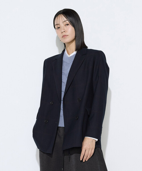 《デザイン》トラッドなムードのウインドペン柄ダブルジャケットです。 単品使いしやすいようコムサらしくシャープな仕立てながらリラックス感のあるサイズ感にしています。バサッと羽織れるのでライトアウター感覚で着られます。裾は広めで直線的なラインにすることでマニッシュな印象です。釦位置も低くいつもより抜け感のあるディティールにすることで、かしこまりすぎず気軽に羽織れて日常使いしやすいジャケットです。抜け感がありつつもだらしなく見えないのはシャープに見えながらも薄い肩パッドや 芯使いによる着心地と着た時に決まる仕上がりを追求しており、 厳選された工場による技術により実現しています。《素材》クラシックなウインドペンを大柄にすることで新鮮でモードな印象です。トップグレーにネイビーラインと、ネイビーにボルドーラインでトラッドな配色です。あえてウールにトリアセテートをブレンドすることで毛羽感を抑え、しなやかさと柔らかくソフトな風合いを生み出しウールの天然素材の良さに加えてよりシャープな印象に仕上げています。ウール100%に比べて見た目のあたたかみはありつつ、トリアセテートの吸湿性によりさらっとした着用感なので暑苦しくなく、長い期間着られる素材です。適度なストレッチ性もあり、快適な着心地です。