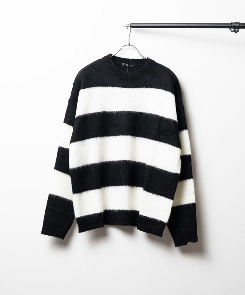 パンキッシュなボーダーニット 厚手のジャガーニットでふんわりと柔らかい素材。 レイヤードで楽しめる着回し抜群アイテム。 オーバーサイズで男女兼用でお使いいただけます。