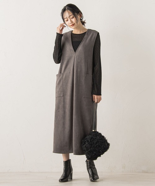 この秋トレンドのフェイクスエードを使用したシーズンの始めにおすすめなジャンスカ。サイドのニットリブ切替えがさりげないデザインポイントに。シンプルなシルエットにすっきりとしたVネックで、リブニットやブラウス合わせまでレイヤードスタイルに着回しやすい1枚です。カジュアルになりがちなスエードを落ち着いた雰囲気で着こなせるカラーにも拘りました。着るだけで今年らしい印象にアップデートしてくれる1枚です。----------------------------------------------------------------洗濯方法家庭洗濯:液温は40℃を限度とし、手洗いができる。自然乾燥:日蔭の吊り干しがよい。アイロン:アイロン仕上げ禁止。ドライクリーニング:石油系溶剤による弱いドライクリーニングができる。----------------------------------------------------------------※画像の商品はサンプルとなりますので実際の商品と仕様、加工、サイズが若干異なる場合がございます。※お客様のモニター環境により実際のお色と多少異なる場合がございます。※撮影状況や光の当たり具合により、色合いが異なって見える場合がございます。※商品タグに記載されたサイズはヌードサイズです。実際の商品のサイズは商品情報の実寸をご確認ください。--------------------------------------------------------------------▼商品のお気に入り登録ハートマークをクリックし、お好きなカラーを選んでお気に入りに登録完売カラーの再入荷通知や、ラスト1点の通知、セールの通知も受け取ることができます。▼ブランドのお気に入り登録新商品や再入荷等、いち早くブランドのお得な情報を受け取ることができます。 --------------------------------------------------------------------
