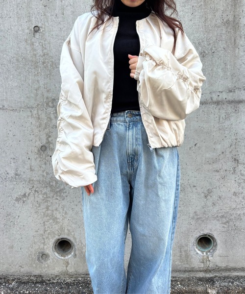 こちらの商品は提携ブランドの商品となります。ボリュームスリーブが目を惹くライトブルゾン。オーバーサイズシルエットで、こなれ感たっぷり◎ニットにもロンTにも合わせやすく、デイリーにヘビロテできる事間違いなし。ゆったりシルエットで気になる体型もカバー。腕周りもゆとりがあって動きやすく、子育て中のママにもぴったり。軽い素材で持ち運びも楽々。春先や秋口の羽織りに最適で、バッグに入れておけば安心◎ポケット付きで実用性も◎デニムと合わせてカジュアルに。ワンピースと合わせて華やかに。綺麗めにも、カジュアルにもバランスよく決まる。一枚あると着回しが効く優秀ブルゾンです。■サイズfree着丈 62cm/肩幅 60cm/バスト 134cm/袖丈 58cm/袖口 19cm〜31cm/裾巾 90cm〜127cm/カフス 3cm※2.3cmの誤差がある場合がございます。ご了承くださいませ。【merry latte(メリーラテ)】かわいいフレンチガーリー(ガーリー)でおしゃれな低身長用コーデ、大人可愛い トレンドアイテムや、上品なきれいめカジュアルコーデ、かわいい韓国風コーデを提案。10代から、20代や30代、40代までの幅広い年齢層のレディースのお客様へ淡色女子からトレンドアイテムまで幅広くお取り扱いする小柄、小さいサイズ、低身長、XSサイズ対応のレディース ブランド メーカーです。▼商品のお気に入り登録お気に入りアイテムの値下げ・再入荷・在庫1点などの通知を受け取ることができます。 ▼ブランドのお気に入り登録新商品や再入荷、セール、クーポン配布などお得な情報を受け取ることができます。※ご注意※※撮影の天候状況により、実際の商品の色味に若干の違いが発生する場合がございます。※ご注文いただいた予約商品のお届け時期の確認は、注文履歴ページより行えます。※他のキャンペーンにより、期間中に価格が変動する場合があります。※セールは予告なく終了させていただく場合もあります