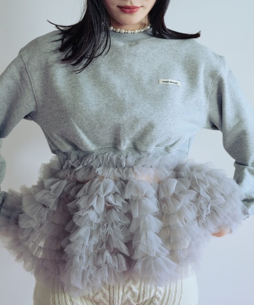 HONEY MI HONEYのアイコンディテール、 チュールペプラムがスウェットになって登場 ZOZOTOWN LIMITED COLOR 【sax】 【Fabric】 ・肌触りの良い柔らかな裏毛素材 ・ペプラム部分はふんわり感のあるチュールをたっぷり使用 ・洗濯後も形を保ちやすい素材感 【Point】 ・カジュアルなスウェットにガーリーなチュールをドッキング ・ウエスト位置を高く見せる切り替えでスタイルアップ ・胸元にはさりげないHONEY MI HONEYロゴネーム 【Styling】 ・同シリーズの【boys sweat pants(25W-DR-PT03)】とセットアップでモードに ・デニムやミニスカと合わせて甘辛MIXコーデに ・スニーカーでデイリー、ブーツでフェミニンにも着こなし可能 【Sizing】 ・ゆったりめのシルエットでインナー重ねもOK ・ヒップにかかる丈感で体型カバーも◎ --------------------------------- 透け感:なし 生地の厚さ:普通 裏地:なし(チュール部分のみ裏地あり) 伸縮性:あり --------------------------------- HONEY MI HONEY / ハニーミーハニー 女性のフェミニンとフェティッシュな美しさを引き出すファッションを提案するブティックをコンセプトに、 大人の女性がときめくコーディネートをお届けします。 --------------------------------- ▼商品をお気に入り登録 ♡をクリック! 完売商品の再入荷やラスト1点の通知、セール開始時にお知らせいたします。 ▼HONEY MI HONEYをお気に入りブランドに登録 新作や再入荷など、ブランド最新情報をいち早くお知らせいたします。 ※商品画像はサンプルの為、色味やサイズ、 素材の混率等の仕様に変更がある場合がございます。 ※商品画像(モデル着用ではない画像)が商品に近いお色味です。 ※他のキャンペーンにより、期間中に価格が変動する場合がございます。 ※セールは予告なく終了させていただく場合がございます。 ※ご注文いただいた予約商品のお届け時期は、 注文履歴ページよりご確認いただけます。 #スウェット #チュール #バレエコア #リラックス #ルームウェア #空港ファッション #スウェットコーデ #らくちんコーデ #セットアップ