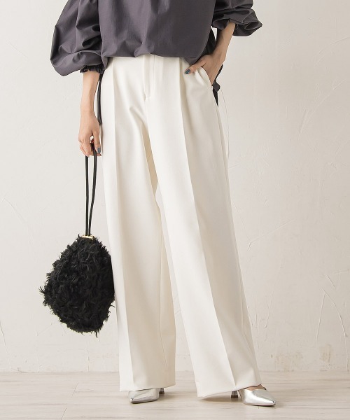 ドロワットで人気の両面起毛パンツがデザインをリニューアルして登場!タックの入ったストレートワイドのラインで、脚を綺麗に見せてくれるシルエットに拘りました。尾州産地のポリエステルレーヨンの柔らかなタッチの素材に、表と裏両面に起毛をかけた温かみのある素材です。縦横2wayストレッチなので着心地も抜群です。後ろウエストをゴム仕様にしており、フロントはフラットでクリーンな印象に。どんなトップスにも合わせやすいベーシックな万能パンツです。・ c/#2 オフは昨年の生地からリニューアルし、透け防止・UVカット機能付きの素材を使用しています。----------------------------------------------------------------洗濯方法家庭洗濯:液温は30℃を限度とし、洗濯機で非常に弱い洗濯ができる。自然乾燥:日蔭の吊り干しがよい。アイロン:底面温度120℃を限度としてアイロン仕上げができる。ドライクリーニング:石油系溶剤による弱いドライクリーニングができる。----------------------------------------------------------------※画像の商品はサンプルとなりますので実際の商品と仕様、加工、サイズが若干異なる場合がございます。※お客様のモニター環境により実際のお色と多少異なる場合がございます。※撮影状況や光の当たり具合により、色合いが異なって見える場合がございます。※商品タグに記載されたサイズはヌードサイズです。実際の商品のサイズは商品情報の実寸をご確認ください。--------------------------------------------------------------------▼商品のお気に入り登録ハートマークをクリックし、お好きなカラーを選んでお気に入りに登録完売カラーの再入荷通知や、ラスト1点の通知、セールの通知も受け取ることができます。▼ブランドのお気に入り登録新商品や再入荷等、いち早くブランドのお得な情報を受け取ることができます。 --------------------------------------------------------------------