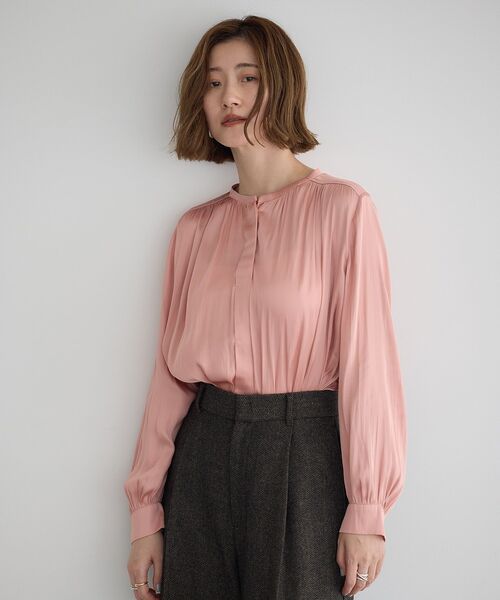 たっぷりギャザーを施した華やかなブラウス。光沢のある柔らかなサテン素材がスタイリングを上品に演出します。バンドカラーと比翼仕立てがすっきりとした印象に。ほんのりフェミニンなスタイリングに決まる、オフィスにもおすすめのアイテムです。透け感[なし]※オフホワイトは[ややあり]生地の厚さ[薄手]光沢感[あり]伸縮性[なし]裏地[なし]ポケット[なし]※モデル着用画像は、光の当たり具合で色味が違って見える場合がございます。※お使いのモニター環境によって商品の色味が違って見える場合がございます-------------------------------------------●YECCA VECCA●(イェッカ ヴェッカ)「大人のハッピーモードな着映え服」毎日を自分らしく、ハッピーに過ごすことにポジティブな女性のためのリアルクローズ。キーワードは「遊び心のある、女性らしいモード服」でも「コンフォート」。都会的で女性らしいムードを大切に着ていて心地よく、気持ちが上向きになるような遊び心のあるデザインウェアをラインナップ。自分自身がわくわく出来る洋服で日常を最大限に楽しむ大人の為のスタイルを提案していきます。▼商品のお気に入り登録がおすすめです ▼商品ページ内のハートマークをクリック。完売時の再入荷や、最後の1点の通知、コーディネート画像がアップされたとき、お得なお値下げの際の通知を受ける事ができます。【お知らせ】ページでも通知が確認できます。-------------------------------------------