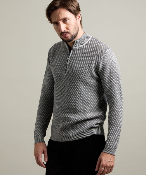 ■デザイン微配色で派手さを抑えながらも存在感のあるバイアスの編地で上品に仕上げたスタンドハーフジッププルオーバーニットになります。コットン/アクリルの為,チクチク感の無い快適な着心地です。薄過ぎず,厚過ぎない,着回し力抜群のウエイト感も魅力です。■サイズややゆったりめのサイズ感で着心地抜群。ウエストにやや絞りを入れたシャープなシルエットも魅力です。■素材コットン/アクリルのレギュラ-32双糸を3本取りして,ハイゲ-ジ12GGで編み立てました。表2本,裏1本で表現したバイヤスジャカ-ドは,しっかりとした度目とシャリ感のある、やや硬めの風合いが特徴になります。伸縮性:あり生地の厚さ:普通■注意点生地の性質上、摩擦によりピリングが起こることがあります。着用時及びクリーニング等の取り扱いに御注意ください。【HIDEAWAYS BLACK】品質を重視し、シックで落ち着いた雰囲気の高級感のあるテイストを基本とし、より大人の男性も着回しやすいシンプルなビジネス対応も視野にいれたドレカジスタイルを提案。ネームも特別なブラックタグを使用し、より高級感を演出しています。※画像の商品はサンプルです。 実際の商品とは仕様・加工・サイズ・素材が若干異なる場合がございます。※掲載画像の商品の色味は、撮影場所や光の当たり具合などにより色味が異なって見える場合がございます。 商品の色味は、生地アップの画像をご参照ください。 また、お客様のお使いのPC・スマートフォン等のモニター環境などにより色味が異なって見える場合がございます。 予めご了承の上ご注文ください。※着用モデル身長182cm B89cm W75cm H90cm 着用サイズ48