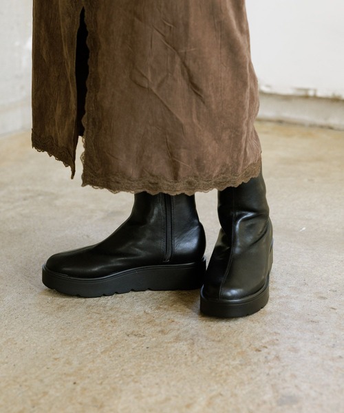 厚底なのに優しい履き心地 スタイルアップが叶うプレーンブーツ ーーー 【素材】 甲材:合成皮革 底材:合成底 【デザイン】 ベーシックに使いやすい3色展開のプレーンブーツ。 厚底ですがウェッジソールを使用しているので、安定感がありスタイルアップも叶います。 アッパーは柔らかく、動きやすいのも嬉しいポイント◎ 【機能】 ・消臭・抗菌防臭効果のあるテープをつま先裏地に付けております。 ・クッション性のあるスポンジを使用したインソールなので柔らかい足当たりです。 ・甲材と裏材に柔らかい素材を使用し優しい履き心地です。 ーーー 【スタイリング】 少し高さがあるので、スカートやワンピース、ジャンスカに合わせていただくのがおすすめ。 パンツ合わせのカジュアルなスタイリングも◎