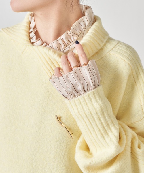 大人におすすめの甘さを抑えたフリルシャツ【POINT】・衿とフロントと袖口がフリルなので、ニットやジャケットから覗かせてレイヤードスタイルをお楽しみください◎・襟元のフリルとパフスリーブが顔周りを華やかに見せてくれます。・袖口のギャザーは伸縮性があるので腕を捲ったり着脱も楽チンです◎・ゆったりめの身頃と軽い着心地でシャツインもしやすいです。【おすすめコーディネート】上までボタンを閉めずに少し開けてラフな印象で着るのもおすすめです。【おすすめのスタイリングアイテム】・ブルージュデニム CLZ5022103A0001・サテンレースレイヤードパンツ CLZ1052502A0004・スリットタートルニット CLZ1052505A0002【素材】ベージュ(ストライプ):レーヨン64%, ポリエステル 24%, ナイロン12%サックス(無地):再生繊維 (セルロース) 100%透け感:ややあり裏地:なし伸縮性:なし光沢感:なしおすすめ着用時期:秋、冬、春洗濯:手洗い可≪返品・交換について≫・着用後、洗濯後の返品・交換は致しかねます。・商品到着後、着用前に商品状態のご確認をお願い致します。・ECサイトでご購入いただいた商品は、お修理を承っておりません。【気になる商品は「お気に入り」登録を】ハートマークをクリックし、お好きなカラーを選んでお気に入りに登録すると入荷情報や残り1点の通知、完売カラーの再入荷、セール情報などを受け取ることができます。※撮影場所やお使いのモニター環境により若干お色味が異なる場合がございます。特にロケの撮影では明るく見える傾向にございます。詳細撮影画像で色味をお確かめくださいます様お願いいたします。※サンプルで撮影をしております。若干の仕様が変更になる場合がございますので予めご了承の上ご注文くださいますようお願いいたします。※サンプルでの採寸のためあくまで目安となります。予めご了承ください。