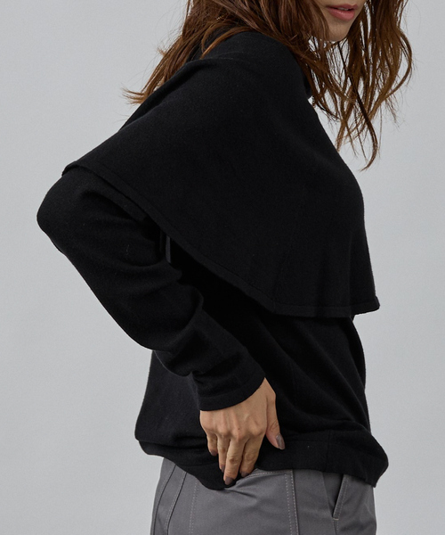 甘さ控えめが嬉しいケープデザイン【Design】落ち感のあるケープデザインのハイネックニット。トレンドのケープデザインをニットに落とし込み、甘すぎず、かつ女性らしいシルエットに仕上げました。ノンウールの程よい肉感のニットは、単品でも存在感たっぷりで、オンオフ使い勝手の良いアイテムです。【Fabric】ノンウールで肌ざわりの良いニット使用。伸びもとても良いので着脱しやすいのも嬉しいポイントです。(ケープ部分は身頃に固定されています)【Styling】ボトムにインすることでよりデザインが際立ってスタイルアップになります。ワイドパンツやスカート合わせがおすすめ。**********************透け感:なし裏地:なし伸縮性:あり光沢感:なし生地の厚さ:普通**********************
