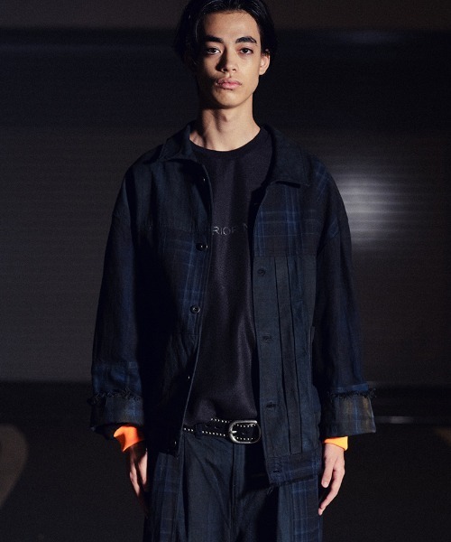 9種類の肉厚の近いチェック素材を用いて制作、うっすらチェック柄が見えるように炭黒に製品染をして統一感を出した1枚仕立てのブルゾンです。 右前はミリタリーブルゾンの様なデザイン、左前はGジャンの様なデザインで左右アシンメトリーに仕上げております。 -ゆるっとしたシルエット-と-チェック柄-で可愛くなりすぎない様に袖口・裾まわりはカットオフ仕様で、甘くて辛いデザインに仕上げております。 *MK26S-P-12 LAMP-PTとセットアップで着用出来ます。 *NEAT SIZE=きっちりしたサイズ感です。 ターゲットは小柄で細めの男性・スッキリ着用したい男性・ゆるっと着用したい女性 *RELAX SIZE=ゆったりとしたオーバーサイズです。 ターゲットはゆったりリラックス感のあるオーバーサイズで着用したい方 日本人男性モデル(身長174cm) BLK/size NEAT 着用 日本人男性モデル(身長185cm) BLK/size RELAX 着用 日本人男性モデル(身長172cm) BLK/size RELAX+NEAT 着用 日本人女性モデル(身長157cm) BLK/size NEAT 着用 外国人男性モデル(身長181cm) BLK/size RELAX 着用