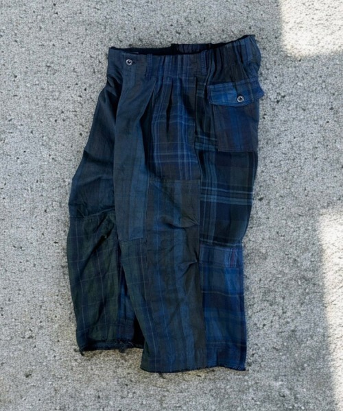 9種類の肉厚の近いチェック素材を用いて制作し、うっすらチェック柄が見えるように炭黒に製品染をして統一感を出したハンパ丈のワイドパンツです。ミリタリーパンツの様な膝のタックデザインやツータックの丸みのあるシルエットで可愛くなりすぎない様に、裾まわりはカットオフ仕様になっており、甘くて辛いデザインに仕上げております。*MK26S-O-05 LAMP-JKとセットアップで着用出来ます。*NEAT SIZE=きっちりしたサイズ感です。ターゲットは小柄で細めの男性・スッキリ着用したい男性・ゆるっと着用したい女性*RELAX SIZE=ゆったりとしたオーバーサイズです。ターゲットはゆったりリラックス感のあるオーバーサイズで着用したい方日本人男性モデル(身長174cm) BLK/size NEAT 着用日本人男性モデル(身長185cm) BLK/size RELAX 着用日本人男性モデル(身長172cm) BLK/size RELAX+NEAT 着用日本人女性モデル(身長157cm) BLK/size NEAT 着用外国人男性モデル(身長181cm) BLK/size RELAX 着用