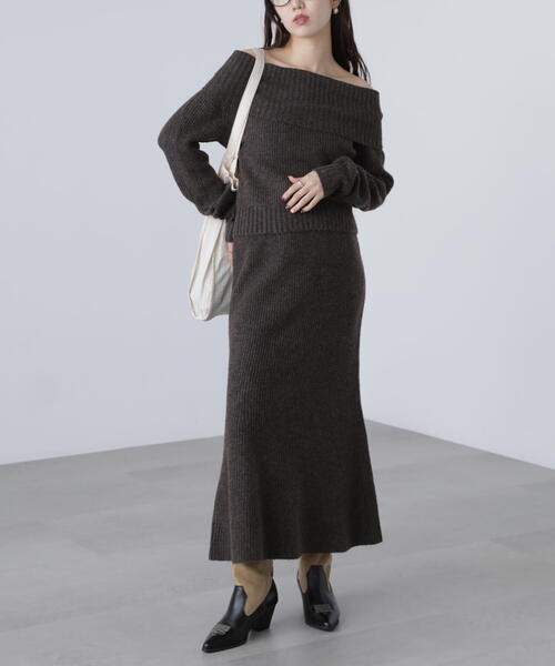 ふわっと柔らかくウォーム感のあるニットのセットアップ。トップスはトレンドのオフショルデザインで、身頃はタイトすぎず、袖と裾のリブでメリハリのあるシルエットを演出。タイトめのスカートは、ラインを拾いすぎないマーメイドシルエットでスタイルアップして見えます。コーデが完成するセットアップは、オフショルの抜け感で女性らしさもあるので、キャップやスニーカーと合わせて外すのがおすすめ。それぞれ単品使いもできるデザインです。オフショルニット×ワイドデニムでカジュアルコーデや、シャツ×マーメイドスカートでキレイめコーデにも着回せます。※モデルの着用画像の場合、光の当たり具合により、実際の色味と異なって見えることがございます。色味は、商品単体の画像をご参照ください。商品特性■透け感:なし■生地の厚さ:厚手■裏地:なし■伸縮性:あり■光沢:なし■シルエット:スタンダード---------------------------------------------------◆商品のお気に入り登録◆お気に入りアイテムの値下げ・再入荷・在庫1点などの通知を受け取ることができます。◆ブランドのお気に入り登録◆新商品や再入荷、セール、クーポン配布などお得な情報を受け取ることができます。---------------------------------------------------