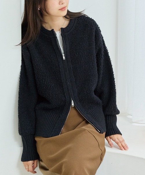 ■デザイン ループ糸で編み上げた、ふんわりと暖かみのあるニットカーディガン。 ボリューム感がありながらも軽やかで、羽織るだけで季節感をプラスしてくれるアイテムです。 袖口と裾には長めのリブを施し、メリハリのあるシルエットに。前開きはダブルジップ仕様で、着こなしに抜け感をプラスしつつ、アレンジも楽しめます。 ■素材 柔らかく、チクチクしないループ糸が特徴のニット素材。 保温性にも優れており、見た目にもあたたかい印象です。 ■コーディネート ワンピースの上にさっと羽織って、秋冬のアウター代わりとしても活躍します。 ダブルジップなので、ボトムを選ばすスカートからパンツまでバランスよく決まります。 ・お手入れ方法:手洗い可 ・マルチサイズ/大きいサイズ対応(F/3L/4L) --------------------------------------- 透け感:なし 裏地:なし 伸縮性:あり 生地の厚さ:普通 --------------------------------------- 【お買いものをよりお楽しみいただく為に♪】 ▼商品のお気に入り登録(ハートマークをクリック) お気に入りアイテムの再入荷やセールの通知も受け取ることができます。 ▼ブランドのお気に入り登録 新商品やクーポン配布などのお得な情報を受け取ることができます。 ■商品注意事項■ ※商品画像は、光の当たり具合やパソコンなどの閲覧環境により、実際の色味と異なって見える場合がございます。予めご了承ください。 ※末永く愛用頂く為に、アテンションタグ・洗濯ネームを必ずご確認の上、着用又はお取り扱い下さい。 ※生産時期により色味が多少異なる場合がございます。予めご了承ください。
