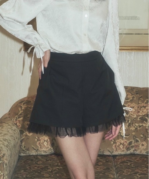 【裾チュールショートパンツ】ハイウエストで裾がやや広め、台形ラインに作られたシンプルで使いやすいショートパンツです。ラインが綺麗なので華奢に見える仕様で、裾のチュールで可愛さもプラスෆ ̖́-嬉しいポケット付き。心地いい裏地付きで透ける心配もクリア。1枚で使っても形が綺麗で使いやすいですが、オーバーサイズの下に仕込んでちょい見せスタイルでも活躍してくれる1枚です。定番で汚れにくく使いやすさもピカイチの黒、合わせやすい&可愛い印象のホワイトをご用意致しました。スタイルがよく見える形と着丈に仕上げたこだわりのアイテム。≪ concept ≫トレンドなどを予測しながら、ガーリ ー以外の系統の商品もガーリーに落とし込み、 今までに見たことのない”可愛い”を生み出すLovilyn/director poyo ▼商品のお気に入り登録完売カラーの再入荷通知や、ラスト1点、セールの通知をお知らせ致します。▼ブランドお気に入り登録新商品や再入荷など、いち早くブランドの情報を受け取ることができます。