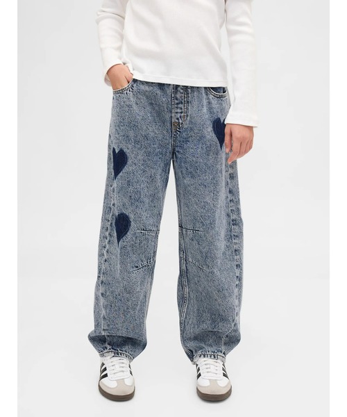 柔らかなノンストレッチデニムで作られた楽ちんバレルパンツ ウエストゴム、フェイクフライ 5ポケットスタイル ツイストフロントシーム 両膝ダーツのディテール ミディアムウォッシュ フロントにコントラストを効かせたハート模様と刺しゅうのディテール サステナビリティ: このデニムは独自の洗浄技術「ウォッシュウェル」を使って生産しています。「ウォッシュウェル」は従来の方式に比べて20%以上の節水を実現する洗浄技術です。 よりサステナブルなコットン: リサイクルコットンを5%使用しています。リサイクル素材を使うことで、バージン材の使用を減らし、資源の節約と廃棄物の削減につながります。 *商品タグに記載の価格とサイト上の販売価格が異なる事があります。 【Gap ギャップ】1969年にアメリカ・サンフランシスコで創業以来、世界的なカジュアルファッションブランドとして、常にモダンなアメリカンカジュアルを提案し続けています。 ※商品画像は、光の当たり具合やパソコンなどの閲覧環境により、実際の色味と異なって見える場合がございます。予めご了承ください。