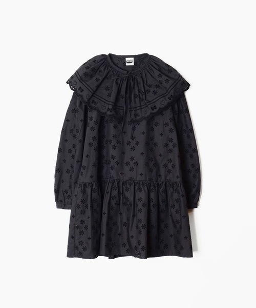 コットンタイプライター生地に花柄を繊細に刺繍したエンブロイダリーレースのミニドレス。ポイントの襟にはさらにリボンとハートをモチーフにしたスカラップを組み合わせています。サイドポケット付き。