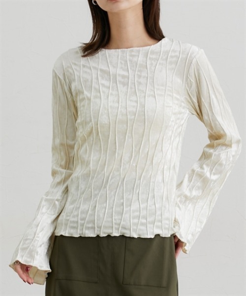 ■デザイン トレンドのベロア素材デザイントップス。ウェーブタックデザインが全体に入っていて着映えするデザインになっています。 袖口はほんのりフレア袖で華奢見せしてくれるデザインです。 ■素材 光沢感のあるベロア素材。 シアーではないので初冬まで使える素材感です。 裾や袖口のメロウ始末もポイントになっています◎ ■おすすめのスタイリング 着丈もすっきりしているのでハイウエストのボトムやお持ちのデニムに合わせてもかわいく決まります。 <仕様> ポリエステル95%・ポリウレタン5% 透け感: 淡色はややあり 伸縮性:あり 生地の厚み:普通 光沢感:あり 裏地:なし ポケット:なし 季節:秋・春 シルエット:普通 <洗濯方法> 手洗い ■キーワード 20代、30代、40代、Tシャツ、きれいめカジュアル、きれかじ、オフィスカジュアル、カットソー、キレカジ、トップス、ファッション、レディース、大人、大人カジュアル、春、秋、通勤カジュアル、ベロア素材、チャコール、ウェーブデザイン、光沢感、デザイン性、洗える素材、立体感、重ね着、着回し、上品、ロングシーズン、高級感、秋冬、ロングシーズン着用、スタイルアップ、華奢見え、着心地、フレア袖、コーディネート、保温、