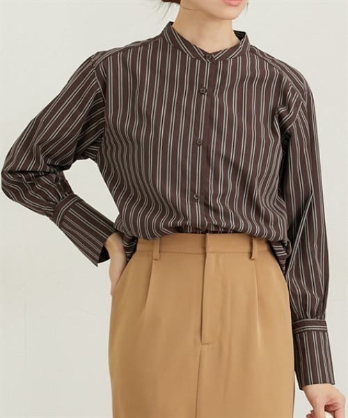 ■デザインゆるっとしたオーバーシルエットでメインで着映える一着。ベーシックながらもワイドなカフスがトレンドライクなシャツです。衿はすっきりしたマオカラーで一枚でもはおりでも使いやすいデザイン。後が長めのデザインでお尻まで隠れる着丈なので着回し力も◎!■素材ポリエステルと綿の混紡素材。しわが目立ちにくくやわらかな素材を使用。綿タッチのさらっとした素材感で通年使いやすい生地を使用しています。ネットに入れて洗濯機洗いOKなのでお手入れも安心!■おすすめのスタイリングトレンドのハイウエストボトムに合わせて、バランスよく片側のみフロントインしてもこなれ感が出ておすすめです。<仕様>ポリエステル65%・綿35% 前開きボタン開き透け感:淡色はややあり伸縮性:なし生地の厚み:普通光沢感:なし裏地:なしポケット:なし季節:秋・春シルエット:ゆったり<洗濯方法>洗濯機OK ネット使用■キーワード20代、30代、40代、きれいめカジュアル、きれかじ、オフィスカジュアル、キレカジ、シャツ、トップス、ファッション、ブラウス、レディース、大人、大人カジュアル、秋、通勤カジュアル、スタンドカラー、マオカラー、ウォッシャブル、レディースファッション、洗濯機OK、ノーカラーシャツ、通年、オーバーシルエット、ゆったり、オンオフ兼用、清潔感、シワ防止、日常使い、着心地、肌触り、体型カバー、ベーシック、