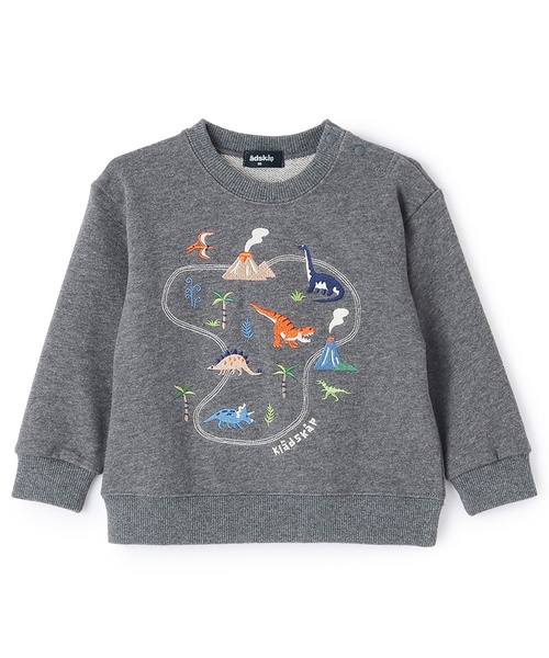 恐竜MAPのようなグラフィックが遊び心のあるトレーナーです。前身頃にはいろいろな恐竜、後ろ身頃には火山と恐竜をデザインしました。肌触りの良い裏毛素材を使用しており、快適な着心地です。内側にお名前を記入できるタグつき。刺しゅうの裏に「あて布」はございません。※80、90サイズのみ肩開き【透け感】透けない【生地の厚さ】普通【伸縮性】あり【裏地】なし【ポケット】なし