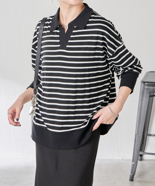 自然と抜け感が出るスキッパーニットソー【POINT】・ポンチ特有のハリとストレッチで着心地が良く、シワにもなりにくいニットソー素材です。・細めのボーダーなので、カジュアルにもきれいめにも着用できます。・ややゆったりしたシルエットで体型を拾いにくいので幅広い体型の方におすすめです。・首元はスキッパーになっており、抜け感とすっきり見えが叶います◎【おすすめコーディネート】カジュアル見えしがちなボーダー柄ですが、ベーシックなカラー展開なので幅広い色のジャケットやベストともレイヤードしやすいです。【おすすめのスタイリングアイテム】・裏起毛ボンディングイージーパンツ CLZ1052502A0001・サテンマーメイドスカート CLS5052301A0001【素材】《ブラック》本体:レーヨン73%, ポリエステル23%, ポリウレタン4%リブ:綿96%, ポリウレタン4% 《グレー》本体:ポリエステル83%, レーヨン13%, ポリウレタン4%リブ:綿96%, ポリウレタン4%透け感:ホワイトのみややあり裏地:なし伸縮性:あり光沢感:なし洗濯:手洗い可≪返品・交換について≫・着用後、洗濯後の返品・交換は致しかねます。・商品到着後、着用前に商品状態のご確認をお願い致します。・ECサイトでご購入いただいた商品は、お修理を承っておりません。【気になる商品は「お気に入り」登録を】ハートマークをクリックし、お好きなカラーを選んでお気に入りに登録すると入荷情報や残り1点の通知、完売カラーの再入荷、セール情報などを受け取ることができます。※撮影場所やお使いのモニター環境により若干お色味が異なる場合がございます。特にロケの撮影では明るく見える傾向にございます。詳細撮影画像で色味をお確かめくださいます様お願いいたします。※サンプルで撮影をしております。若干の仕様が変更になる場合がございますので予めご了承の上ご注文くださいますようお願いいたします。※サンプルでの採寸のためあくまで目安となります。予めご了承ください。