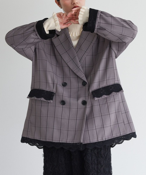 ■デザイン オーバーサイズのゆるっとシルエットで、こなれ見えするジャケット。ポケットと裾部分には配色のレースを施し、メンズライクになりすぎないよう、さり気ない女性らしさをプラス。 袖口を折ると裏地のレースが見え、着こなしのアクセントになります。 異なる柄展開で、それぞれ雰囲気の違うコーディネートをお楽しみいただけます。 ■コーディネート シンプルなトップスに合わせるだけでお洒落見えするチェック柄ジャケット。 カジュアルにもキレイめにも使えるデザインで、スカート・パンツスタイルどちらにも合う一着です。 ■素材 程良い厚みのポリエステル混ツイル生地に、上品なレース生地を合わせました。 さらりとした裏地付きで、もたつかずさっと羽織れます。 秋冬らしいチェック柄がコーディネートに映える一着です。