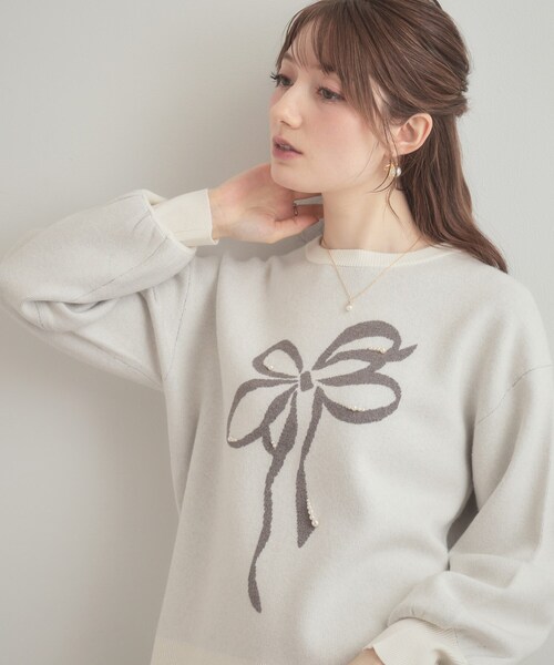 リボン柄ジャカードにポイントでフェイクパールを縫い付けてたニットトップス!~POINT~冬のアウターインに華やぎを添える一枚です!ベーシックな大人っぽい色展開で、幅広い年齢層の方に着用いただけます◎【素材・機能】モッチリとした柔らかいタッチのレーヨンナイロンPBT素材を使用全面ジャガード編みで、しっかりとした肉感のあるトップスです。※照明の関係により、実際よりも色味が違って見える場合があります。また、パソコン・スマートフォンなどの環境により、若干製品と画像のカラーが異なる場合もございます。【スタッフコメント】shino(164 )印象的なリボン柄がコーディネートを大人可愛くしてくれるので、お出かけなどにぴったりのアイテムです◎リボン柄に使用されているカラーをボトムにチョイスすると、統一感のあるすっきりとしたスタイルにまとまります◎【25AW NEW ARRIVAL】【25AW NEW COLLECTION】モデル情報:身長163cm B81 W56 H82 着用サイズ:38(M)店舗へのお問い合わせ商品番号:508-14005●製品寸法:38(M):着丈57cm B98cm 袖丈51cm 肩幅48cm42(LL):着丈58cm B116cm 袖丈53cm 肩幅52cm備考: