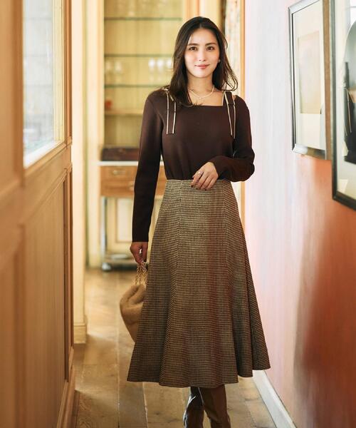 6枚ハギのパネルソフトマーメイドフレアースカート~POINT~ウエストベルト無しで、スッキリとしたシルエット【素材・機能】ウールライクな小さな千鳥柄の先染めツイード生地を使用上品なシルバーラメ混【仕様】・ポケットなし・左脇ファスナー・ウエスト後ろゴム・裏地あり※照明の関係により、実際よりも色味が違って見える場合があります。また、パソコン・スマートフォンなどの環境により、若干製品と画像のカラーが異なる場合もございます。【スタッフコメント】shino(164 )細かい千鳥柄が大人上品なコーディネートにぴったりです◎使いやすいベーシックカラーなので、トップスにアクセントになるカラーを取り入れるのもおすすめです!【25AW NEW ARRIVAL】【25AW NEW COLLECTION】モデル情報:身長163cm B81 W56 H82 着用サイズ:38(M)店舗へのお問い合わせ商品番号:508-74014●製品寸法:36(S):W63cm H95cm 総丈77cm38(M):W66cm H98cm 総丈79cm40(L):W69cm H101cm 総丈81cm42(LL):W72cm H104cm 総丈82cm備考: