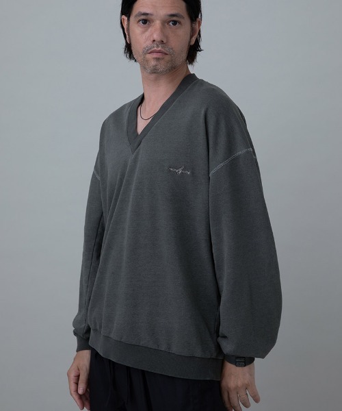 PROPA9ANDA×EGO 3DSWEAT カットソーではあまり使用されない立体的なパターンを採用したVネックスウェットです。 滑らかなショルダーラインを実現するため後ろに流したショルダーライン、前振りに設定したジャケットのような形状の袖、前後差のついたアームホールなど、まるでテーラードジャケットのような立体的なパターンで仕上げています。 しっとりとしたタッチのミニ裏毛を使用し、製品段階で黒のピグメント染色を施した後にバイオ加工を行うことで、男らしい粗野な雰囲気を出しています。 この特殊な加工により、単なるスウェットとは一線を画す独特の風合いと質感を実現し、着込むほどに味わいが増していく経年変化も楽しめます。 テーラード的な立体パターンがもたらす美しいシルエットと、ピグメント染色による無骨な表情のコントラストが絶妙なバランスを生み出します。 春の立ち上がりからしっかりと活躍してくれるアイテムです。 プロパガンダとのコラボ商品のため左胸に刺繍が入ります。 加工済みのため、家庭での洗濯による縮みもありません。 立体的な美しさと男らしさを兼ね備えた1着です。 03:GRAY H175cmのモデルが48サイズを着用