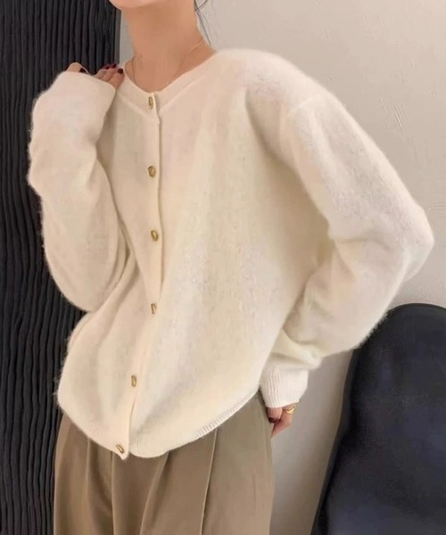 きらりと光る、上品アクセント。ゴールドボタンの洗練カーディガン。■デザインベーシックなクルーネックに、ゴールドボタンが華やかさを添えるニットカーディガン。シンプルなシルエットに上品なアクセントを加え、オンにもオフにも使える万能デザイン。程よくフィットするサイズ感で、すっきりとした着こなしが叶います。■素材ふんわりと柔らかく軽やかな着心地。チクチクしにくく、肌当たりも優しいため長時間の着用も快適。程よい厚みがあり、秋冬のレイヤードにもぴったりです。■スタイリングボタンを閉じてプルオーバー風に着ても、開けて羽織っても◎。スラックスやスカートと合わせてきれいめに、デニムと合わせてカジュアルにも。アクセサリーは控えめにまとめて、ゴールドボタンを主役にしたスタイルがおすすめです。-----------------透け感:なし伸縮性:あり裏地:なし-----------------【スタッフが着用しました!】身長:158cm普段着用サイズ:S~Mサイズ今回着用サイズ:FREEサイズ■着用感適度なフィット感で、すっきりとした美ラインを演出。肩まわりや身幅に程よくゆとりがあり、インナーとの重ね着も快適。一枚で着映えする、着回し力抜群のベーシックカーディガンです。-----------------------------------------------【お買い物をよりお楽しみいただく為に】▼お気に入り登録サイズ・カラーを指定して、♡マークをクリック![セール通知・ラスト1点の通知・完売アイテムの再入荷通知]を受け取ることができます。▼ブランドのお気に入り登録新商品や再入荷、タイムセールやクーポン等いち早くブランドのお得な情報を受け取ることができます。-----------------------------------------------※取り扱い上のご注意染色の特性上、発汗や摩擦により色落ちしたり他のものに色移りすることがありますのでご注意ください。韓国 オフィスカジュアルガーリー大人カジュアル韓国ファッション秋服冬服