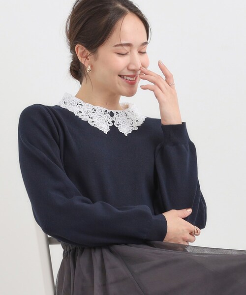 【デザイン】白いレース襟が上品な印象のニットです。ピタピタしすぎないシルエットで、心地よいシルエットにこだわりました。襟は取り外し可能でオンオフ問わずシーンやコーデによって着回しが可能な便利アイテムです。【スタイリング】襟つきなら一枚着として、テーパードパンツやワイドパンツ、スカートあわせでフェミニンな印象に。フェミニンコーデが苦手な方でも襟を外していただくとシンプルな無地ニットになりますので、デニムパンツなどと合わせてカジュアルに着こなせます。【素材】柔らかく、すっきりした表面にあがるニット素材を使用しています。※照明の関係により、実際よりも色味が違って見える場合があります。また、パソコン・スマートフォンなどの環境により、若干製品と画像のカラーが異なる場合もございます。モデル情報:身長163cm B81 W59 H88 着用サイズ:02(M)店舗へのお問い合わせ商品番号:741-14027●製品寸法:01(S):着丈49cm B98cm 袖丈57cm 肩幅35cm 付属つけ襟全長42cm 付属つけ衿幅7cm02(M):着丈51cm B101cm 袖丈58cm 肩幅36cm 付属つけ襟全長43cm 付属つけ衿幅7cm03(L):着丈53cm B104cm 袖丈59cm 肩幅37cm 付属つけ襟全長43cm 付属つけ衿幅7cm04(LL):着丈54cm B108cm 袖丈60cm 肩幅38cm 付属つけ襟全長44cm 付属つけ衿幅7cm備考: