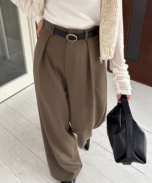 アシンメトリーのベルトループが他にないデザインパンツ商品ポイント・左右でデザインの違うベルトループがポイント・合皮ベルトがセットに・柔らかく落ち感のある素材で履き心地も◎・太すぎないストレートシルエットでニットやスウェット合わせもすっきり着られる・杢調の生地で表面感があり高見えする1枚スタイリングポイント・コンパクトなトップスをインして着るのがおすすめ・Wジップ仕様のトップスを合わせて裾を開けてベルトをチラ見せさせるスタイリングも◎※付属のベルトは着用前に、取り付けてください。後ろのゴムを伸ばしながら通すとスムーズです。【ベージュ着用サイズ】スクエアパフニット【ブラウン着用サイズ①】inner:テンセルウール袖ギャザーロンT・vest:ハンドニットベスト【ブラウン着用サイズ②】フレアカフスニット【チャコールグレー着用サイズ①】フレアカフスニット【チャコールグレー着用サイズ②】フェザーラップカーディガン**********************透け感:なし裏地:なし伸縮性:ややあり光沢感:なし**********************▼洗濯方法手洗い可能洗濯はドライクリーニングをお勧めしますが、手洗いの際は、次の点にご注意頂き、お取り扱い頂けます様、お願いいたします。※長時間水に浸漬しないで下さい。※ネット使用、もしくは裏返してお洗い下さい。※この製品は、洗濯の際、多少の色落ちします。他のものと別に洗って下さい。※洗濯後は、製品を手の平で軽く叩いてシワを伸ばし、型くずれしないように形を整えて日陰に干して下さい。※洗濯で若干縮みが生じることがございますのでご了承下さい。 ※撮影場所やお使いのモニター環境により若干お色味が異なる場合がございます。特にロケの撮影では明るく見える傾向にございます。※商品はサンプルで撮影をしております。若干の仕様が変更になる場合がございますので予めご了承の上ご注文くださいますようお願いいたします。▼商品のお気に入り登録完売カラーの再入荷通知や、ラスト1点の通知、セールの通知も受け取ることができます。▼ブランドのお気に入り登録新商品や再入荷など、いち早くブランドのお得な情報を受け取ることができます。