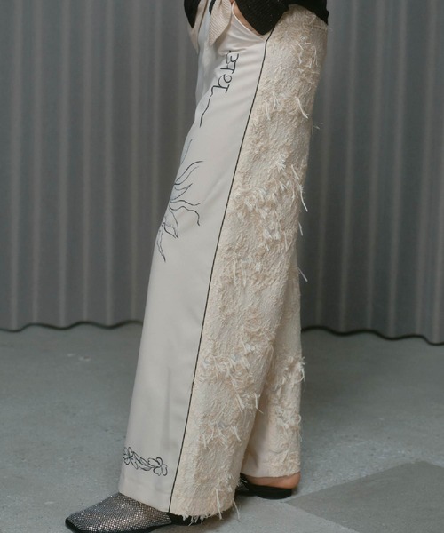 『PRE-SENT』のコンセプトを落とし込んだ異素材使いが印象的なパンツ。 サンスクリット語で「今」を意味する「ATHA」。 そこには、過去と未来のあわいに存在する瞬間の尊さが宿っている。 変容と再生、そして幸福の象徴である蝶を、過去を受け入れ肯定することで生まれる「贈りもの」としての花と重ね合わせた。 積み重なった過去が現在を形づくり、その連なりが未来へと繋がっていく。 タイトルに込めた「PRE-SENT」は、過去(PRE)と現在(PRESENT)、さらに贈りもの(PRESENT)という多義的な意味を内包する。 それは、時間を超えて自己と向き合い、肯定することで開かれる「いま」という存在そのものを象徴している 透け感:なし 裏地:あり 伸縮性:なし 光沢感:なし 生地の厚さ:普通 MATERIAL 【本体】 メランジ調のレーヨンタッチのポリエステルストレッチ素材 【別布】 意匠的なジャガード素材 ※画像の商品はサンプルです。実際の商品と仕様、色味が若干異なる場合があります。また 、パソコンやスマートフォンのモニター環境などにより、色味が違って見える場合がございます。 予めご了承ください。 ※店頭及び屋外での撮影画像は、光の当たり具合で色味が違って見える場合があります。 THINGS THAT MATTER (シングス ザット マター) まったく新しいアプローチで、コレクションを展開、感じることの大切さを伝えるブランド。 クリエイティブディレクターにはデザイナー武笠綾子を起用。 自分の内側に目を向け、自分を愛するきっかけになってほしい。 自分を愛することで一人ひとりの魂が満たされ、エネルギーが整い、正しく循環することでこの星のすべてを愛することに繋がる。 【 気になるアイテムはお気に入り登録をお勧めします!】 ♡マークをクリックし、再入荷やラスト1点の通知、セールなどのお知らせを受けることができ、お買い物が楽しめます。 ブランドのお気に入り登録もぜひお願いします!