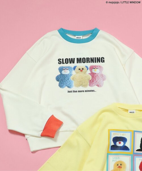 【mojojojo】ぬいぐるみ作家、尾崎歩美さんがつくる“のほほ~ん”としたおとぼけな表情が愛くるしいmojojojo(モジョジョジョ)とのコラボレーション♪ゆったりしたシルエットがかわいいレディースサイズのトレーナーです。転写プリントで様々なTodd Friends(トッド フレンズ)のぬいぐるみたちを表現◎BREEZEのために生まれた、耳の青いクマDozy (ドージー)をはじめ、たくさんのかわいいTodd Friends(トッド フレンズ)をデザインしました♪キッズサイズとボディーオールもご用意。みんなでおそろいも楽しんで♪【取り扱い表示】40℃を上限に洗濯機で洗濯、デリケートアイテムモード、ネット使用、漂白剤を使用禁止、色物は同系の色と一緒に、洗濯後直ちに取出し、タンブル乾燥不可、日陰で吊り干し、低温でアイロン、商業ドライクリーニング不可【ご注意事項】この商品は着用中の摩擦や洗濯により毛羽の乱れ、毛羽脱落、毛玉が生じることが有ります。できるだけ美しくご利用頂く為に次のことにご留意下さい。○毛玉は毛玉取り器またはハサミで丁寧にカットして下さい。○毛羽が他に付着した際はテープやブラシで除去して下さい。○他の製品とは洗わず、単独でお洗濯して下さい。○タンブル乾燥はお避け下さい。※商品により多少の誤差が生じる事がございます。あらかじめご了承下さい。※ご使用のパソコンやブラウザの環境により、実際の色とは多少異なる場合がございます。※モデル着用写真についてはイメージの為、実際の商品とカラーや仕様が異なる場合がございますので、商品画像をご覧ください。【 BREEZE -ブリーズ- 】WEAR A HAPPY SMILEこだわりと遊び心のつまった、着ると「笑顔」のWEAR、「着たい」がいっぱいのSHOPそんなHAPPY SMILEに出会える場所がBREEZE