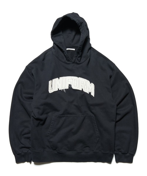 フェード加工によって適度な色落ち感を出したパイル編みのコットンボディに、断ち切りのシーチング生地でアーチロゴをパッチワークしたスウェットフーディー。クルーネックスウェット、Tシャツ、ストライプシャツとともに、手作業のようなラフさをあえて残すことで今季のテーマ “UNFINISHED”に沿ったイメージを表現しています。ゆとりを持たせたリラックスフィットに仕上げているため、中にシャツを挟むなど多様な着こなしが可能です。