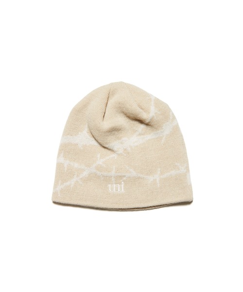 絡み合った有刺鉄線を大胆にデザインに落とし込み、UEらしいパンクのテイストを盛り込んだスポーティーなシングルビーニー。合わせやすいBLACK、BEIGEの2色を展開し、前面にはシーズナルなuniロゴをあしらうことで程よいアクセントを加えています。