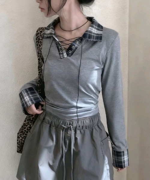 💫レースアップチェックカラートップス💫 ブランド品番:D12536021 ガーリーでちょっぴりクールな新作トップスが登場🎀首元のレースアップとチェック柄の襟・カフスが目を引く✨甘すぎないデザインで大人可愛い印象に💋 ボディラインを綺麗に見せてくれるシルエットで、着るだけでスタイルアップ効果も抜群です💫 🌈カラー展開 🤍ホワイト:清楚で柔らかい印象の定番カラー🍒🖤ブラック:モード感漂う大人ガーリー🖤💙ネイビー:落ち着きのある上品カラー🌙🌫グレー:抜け感のあるクールガーリー🩶 どの色も雰囲気が違って、色違いで揃えたくなる可愛さ🎀 🌸デザインポイント ・レースアップデザインでデコルテを綺麗に魅せる💋 ・チェック柄の襟&袖口がアクセント✨・程よく身体にフィットするラインで女性らしいシルエットに🪞・柔らかく伸縮性のある素材で着心地抜群🧸・1枚でコーデが決まる主役トップス💫 💕おすすめコーデ 👗 ミニスカートと合わせてガーリーY2K風🍓👖 デニムと合わせてカジュアル可愛い雰囲気に🌼🧥 ジャケットのインナーとしても◎秋冬のレイヤードにぴったり🍂🎒 スニーカーでストリートガーリーに仕上げても可愛い💞 💫Fabric / Detail ・程よい厚みでロングシーズン着用OK🍁・柔らかくストレッチ性のある生地✨・襟と袖口はトレンドのチェック柄💙・胸元のレースアップは調節可能🎀 ☆モデル☆ 身長:158cm 着用サイズ:M ※お客様の体型や身長により写真のモデルとの着用感に多少の違いが出る場合がございます。 ☆伸縮性:あり ☆透け感:なし ☆裏地:なし 原産国:CHINA ※撮影時のライティング、ご覧になっているモニター・PC環境により実際の商品と色味が異なって見える場合がございます。※実測値の為、多少の誤差はご了承下さい。※輸送時や梱包による、多少のシワがある場合がございます。※ご了承の上お買い求め下さい。 【是非ハートボタンを押してご登録下さい】▼商品のお気に入り登録・セールや再入荷の通知が届きます。▼ブランドのお気に入り登録・新作入荷やセール情報、再入荷などが届いち早く届きます。
