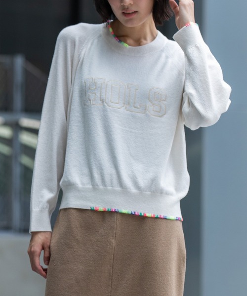 □ 2025 AUTUMN & WINTER COLLECTION □ ◆クラフト感ある刺繍やステッチを利かせた軽さと温かみを持ち合わせたハイゲージニット◆ <MATERIAL> ウールとコットンで紡績された糸を ストレッチを含んだナイロンに巻き付ける様に撚糸しているので膨らみ、スポンジ性のある糸に仕上がっています。 ウールの暖かみ、コットンの肌触りの良さ、ストレッチ糸による程良い張り感とドレープ感がバランス良くミックスされています。 また製品も軽く毛羽立ちがあり、暖かみのある仕上がりになります。 色合いに関してもコットンとウールでのTOP染めの紡績により獣毛混の様なメランジカラーになり、陰影のある深みと発色の良さも特徴の一つです。 12GGで天竺編みに編立て、空気を含んだようなふんわりとした柔らかさと、もちっとした独特の肌触り、さらりと心地良く着られる風合いに仕上げました。 <DESIGN> ラグランスリーブのシンプルなロゴ刺繍ニット。 程良いボックスシルエットでボトムを選ばないラフなシルエットに仕上げています。 衿ぐり、袖口、裾に、手縫い風のブランケットステッチをまばらに施し、温かみのある雰囲気にエッジを効かせたアクセントにしています。 刺繍はカレッジ風のロゴでカジュアル感を出しつつ、中抜きの枠のみのサテン刺繍でキレイ目に仕上げているので、小技の詰まったアイテムですが、大人が着やすい雰囲気にまとめています。 「HOLS」はカジュアルな日常会話での「休暇」を表す単語holidaysの略語。 <COLOR> ■ホワイト:クリアなホワイト。黄みを抑えたピュアなトーンで、同系色の刺繍が清潔感と軽やかさを演出 ■チャコールグレー:黒に近い深みのあるグレー。青みを含んだクールトーンで、同系色の刺繍がモード感を演出 ■ベージュ:赤みを抑えた落ち着いたベージュ。肌なじみが良く、グリーンの刺繍が際立つナチュラルなトーン ※光のあたり具合いやパソコンなどのモニター環境によって実際の色味と異なって見える場合がございますので、予めご了承ください。 ※着用商品はサンプルです。サイズ等の仕様に若干の変更がある場合がございますので、予めご了承ください。 ※お取扱いについては、商品についております品質表示、アテンションタグにてご確認ください。 洗濯:手洗い可 .............................≪INFORMATION ≫............................ ▼商品のお気に入り登録▼ 『♡』マークを押してお気に入り登録して頂いた商品は、セール開催の通知やクーポン発行などのキャンペーンなど、お得な情報をいち早く受けとる事が出来ますので、ぜひご登録ください。