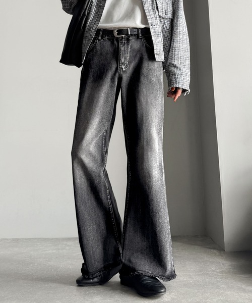 ブラスト&裾フリンジ加工ストレッチ素材スリムフレアデニムパンツ/Blasted & Fringed Stretch Slim Flare Denim Pants