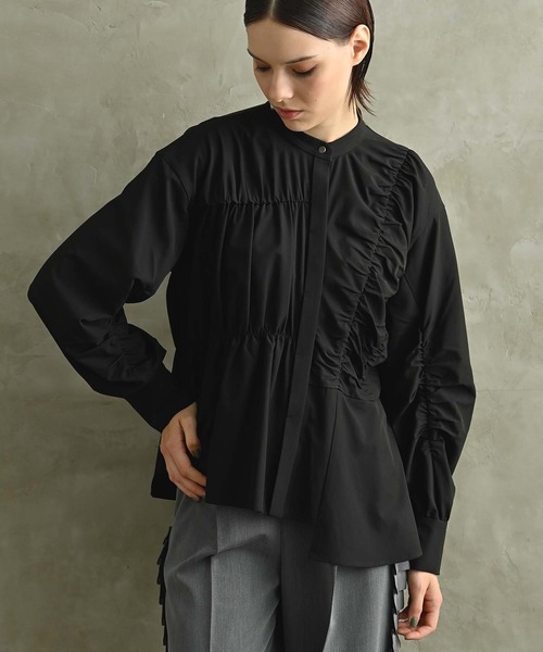 エッジの効いたシャーリングブラウス【デザイン&ディテールポイント】ストレッチの効いたソフトな肌触りが心地よいシャーリングディティールのブラウス。シワになりにくい素材で、きれいな表情をキープ。フロントとサイドに寄せたシャーリングが立体感を生み、アシンメトリーなヘムでシンプルながら華やかな印象に。デイリーにもオフィスにも、シーンを選ばず着まわせる映えアイテム。【スタイリングポイント】マニッシュなワイドパンツに合わせた、モノトーンスタイルがおすすめ■使用上の注意濃色の物は汗や雨でぬれた時、又は強い摩擦により色移りすることがあります。濡れた状態での放置、重ね置きをしないでください。軽く押し洗いをして下さい。あて布使用。シャーリング部分にはアイロンはおさけ下さい。===========================厚み:普通伸縮性:ややあり裏地:なし透け感:ややあり生地感:普通洗濯:手洗い可===========================【RAWFUDGE/ローファッジ】30代の女性が着たいリアル服を作りたいそんな思いから女性が中心となり立ち上げたブランドです。【Mode】【Standard】【Luxe】をキーワードに大人女性に向けシンプルの中に遊び心のあるシャツ・ブラウスを中心に心地良さとオシャレを両立させる、ありそうでない進化系リアルクローズを提案します。