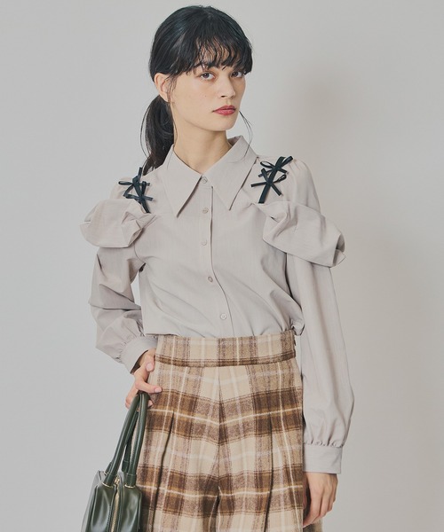 リボン×フリルの存在感、羽織るだけで華やぐガーリーブラウス肩にあしらわれた立体リボンとフリルディテールが目を惹くデザインブラウス。程よくボリューム感のあるショルダーが華奢見えを叶え、オフショルライクな切り替えデザインでトレンド感も抜群。シンプルながら存在感のある1枚で、ジャンスカやキャミワンピとのレイヤードコーデにも映えるデザイン性が魅力です。ハリ感のある生地で上品さもあり、カジュアルからガーリーコーデまで幅広く対応。チェック柄スカートやローファー、ベレー帽を合わせれば、秋らしいトラッドガーリースタイルが完成します。透け感:[ホワイト・ベージュ]ややあり [グレー]なし裏地:なし伸縮性:なし生地の厚さ:普通F:着丈52cm 身幅47.5cm 肩幅32cm 袖丈63cm