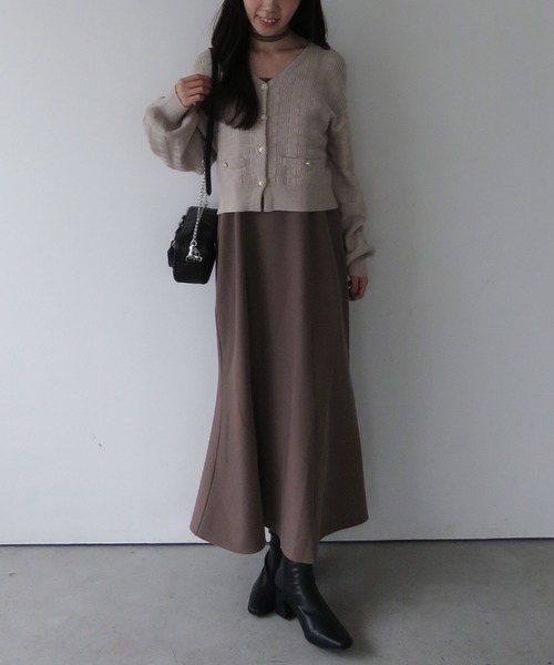 ■上品見え着映えワンピース■大人見えするセットワンピースは着映えポイントも盛りだくさん!金ボタンがポイントのカーディガン。柄編みの生地は高見えに。首元はVネックで顔回りすっきりと着こなして頂けます。セットのワンピースはスタイルアップするマーメイドシルエット。落ち感のある生地でオンオフどちらでも着こなせます。肩ひも部分はチョーカー風にアレンジ可能!クロスにしたり、ネックレス風にしたりとお好みで変えて頂けます。セットで着映えるワンピースは冬のお出かけシーズンにぴったりです。ーーーーーーーーーーーーーーー透け感:なし裏地:なし伸縮性:あり光沢感:なし生地厚さ:普通洗濯方法:洗濯可※詳しいお手入れ方法は商品についているタグをご覧くださいーーーーーーーーーーーーーーー※ご利用のモニター環境により、実際の色味と多少異なる場合がございます。… information … 欲しいitemをお気に入り登録(♡マークをclick) ・お買いのがし対策…完売itemの再入荷やラスト1点の情報をお知らせ ・欲しいitemをお得にget…pricedownになったらいち早くお知らせ ・スムーズ検索…ZOZOのお気に入りアイテムページで簡単checkできるから、再検索不要♪