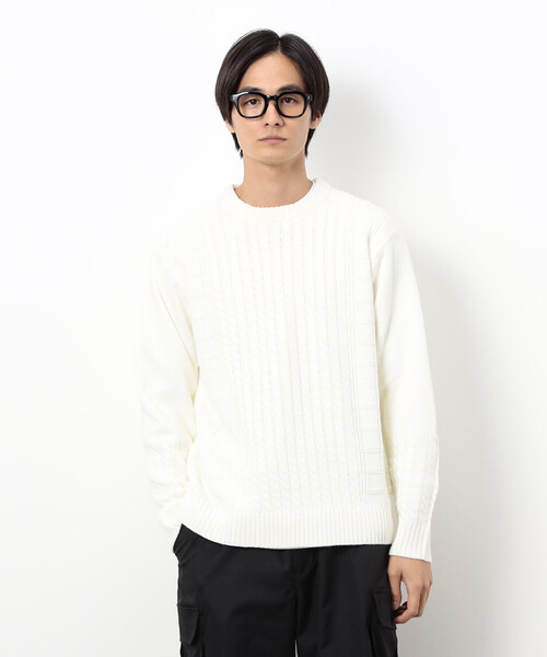 《デザイン》ミドルゲージ(7ゲ-ジ)でケーブル編み、リンクスチェック編み、天竺編みの三種類の編地を使用してブロッキングデザインに仕上げました。ブロッキングデザインですが同色の糸を使用しているのでON/OFF問わず着ていただけます。ベーシックなサイズ感でジャケットやアウターのインナーとしてお勧めです。《素材》ハイバルキーアクリル糸を使用。アクリル糸を染色する際に収縮性を活かして中に空気が入り、膨らませた糸です。膨らみがあり、より軽く、より保温性に優れた糸です。《取り扱い注意》雨や汗等で濡れた時、強くこすられた場合多少の色落ち、移染することがあります。長時間の直射日光で日焼けや変色、黄変することがあります。着用の際、毛玉(ピリング)が発生する場合があります。毛玉が出来た際は引っ張らず、小さなハサミで丁寧に取り除いてください。……………………透け感:なし厚さ:普通伸縮性:あり光沢感:なし裏地:なし洗濯方法:液温30℃を限度とし手洗い(ネット使用/単独洗い)ドライクリーニング(セキユ系)は禁止です。……………………