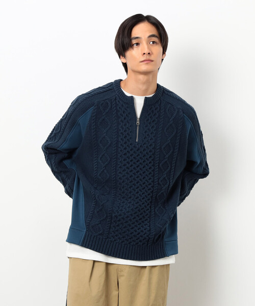 《デザイン》好評のニットとカットソーを組み合わせたデザインの新作です。ハーフジップのデザインで冬の定番アランニットを新鮮なイメージになるように仕上げました。前身頃と袖の上側がアランニット、袖下と後身頃が裏シャギーです。裏シャギーと組み合わせることで軽いイメージになるので、秋の早い時期から冬本番、春先まで着用していただけます。脇線を前身頃に斜めにずらして変化をつけたデザインがポイントです。脇スッキリ見え効果もあります。ジップの開け方で首回りの雰囲気を変えていただけます。《素材》バルキーアクリル×裏シャギー<バルキーアクリル>膨らみのあるバルキーアクリルの糸で編むケーブル柄のニットです。ケーブルの立体感が出るような仕様にこだわっています。<裏シャギー>しっかりとした厚みで温かみがあり、滑らかで肌触りの良い裏シャギー素材です。