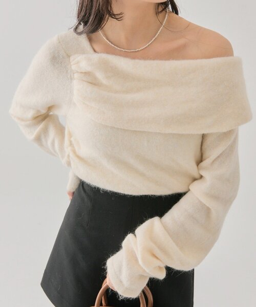 ●デザイン ・ワンショルデザインなので、オフショルが苦手な方にも程よい肌見せが挑戦できます。 ・ワンショルデザインですが、苦手な方は肩出しをしなくても着て頂けます。 ・ウエストとワンショル部分にギャザーが寄るので、スタイルアップも叶います。 ●スタイリング ・デニム合わせでカジュアルにも、ミニボトムス合わせで女子っぽくも、 幅広いボトムスに合わせることが出来ます。 ・スッキリしたデザインのニットなので、アウターを重ねても着やすいです。 ●おすすめスタイリングアイテム レース切替デニム スリットミニスカパン ウェーブベルトスラックス ●スタッフ着用コメント ・身長157㎝ 骨格ウェーブ 胸元開きすぎるものは苦手なのですが、 しっかりフィット感もあるので安心感もありました。 柔らかいふわふわ素材で、着心地も良かったです。 ・身長164㎝ 骨格ストレート インスタイルも出来る丈感で、安心です。 肩が少しだけ出てくれるデザインなので、 上半身の抜け感が協調されてバランスの良いシルエットで着ることができました。 ●素材 ----------------------------------------------------- 洗濯:40度限度 手洗い/石油系ドライクリーニング可 アイロン:低温120℃まで (あて布使用) タンブル乾燥:不可 裏地:なし 伸縮性:あり 光沢感:なし 生地の厚さ:普通 ------------------------------------------------------ 商品のお気に入り登録➡ お気に入りアイテムの値下げ・再入荷・在庫1点などの通知を受け取ることができます。 ブランドのお気に入り登録➡ 新商品や再入荷、セール、クーポン配布などお得な情報を受け取ることができます。 ※サイト上のカラー名と、お届け商品に記載されているカラー名が異なる場合がございます。 ※商品の色味は、撮影場所や光のあたり具合などにより色味が違って見える場合が御座います 。 また、お客様のお使いのPCのモニター環境などにより色味が違って見える場合が御座います。予めご了承の上ご注文下さい。 ※ご注文いただいた予約商品のお届け時期の確認は、注文履歴ページより行えます。 ------------------------------------------------------