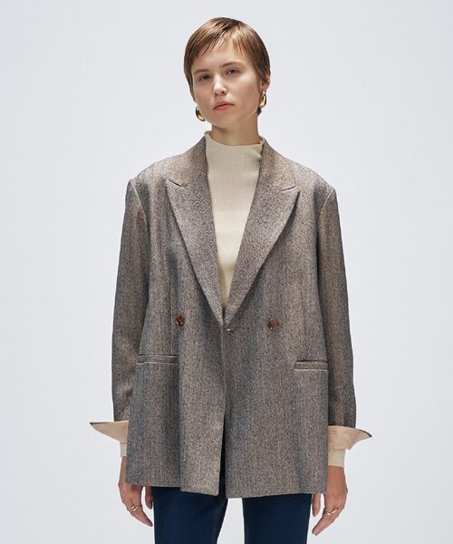 【デザイン】 ・ツイードのような表面感で、シーズンライクなヘリンボーンジャケット。 ・裏地のアクセントカラーが袖口からちらりと覗き、さりげないこだわりに。 ・シャープなラペル襟と縦長の衿デザインで顔周りをすっきり見せ、オン・オフで活躍。 ・ヒップまで隠れる着丈と程よいゆとりのあるシルエットで体型カバーも◎。 ・アームホールを広めに設計しているため、ニットやスウェットなど厚手のインナーも着こみやすいサイズ感。 ・同素材のボトムとセットアップ着用も可能。 【素材】 ・柔らかく上品な風合いのヘリンボーン素材を使用。 ・ほんのり起毛感があり、季節感を感じるウォームなテクスチャー。 ・厚すぎず、裏地付きでしっかりとした質感。 【着こなしポイント】 ・同素材のパンツと合わせたセットアップスタイルで、オフィスカジュアルや通勤シーンにもおすすめ。 ・シンプルなアイテムにも、さっと羽織るだけでサマになる一着。 ・インナーにタートルネックやブラウスを合わせることで、上品にもカジュアルにも幅広く着回せます。 モデル身長:173cm ーーーーーーーーーーーーーーーーーー 気になるアイテムはお気に入り登録がおすすめ! お気に入り登録で、再入荷通知やお値下げ情報をお知らせ。 お得な情報をいち早くお届けいたします! アイテムページにある、ハートマークをクリックして追加できます。 ーーーーーーーーーーーーーーーーーー ※照明の関係により、実際よりも色味が違って見える場合があります。また、パソコン・スマートフォンなどの環境により、若干製品と画像のカラーが異なる場合もございます。 店舗へのお問い合わせ商品番号:R91-44013 ●製品寸法: 01(S):着丈69cm B100cm 袖丈59cm 肩幅43cm 02(M):着丈70cm B103cm 袖丈60cm 肩幅44cm 03(L):着丈72cm B106cm 袖丈61cm 肩幅45cm 備考: