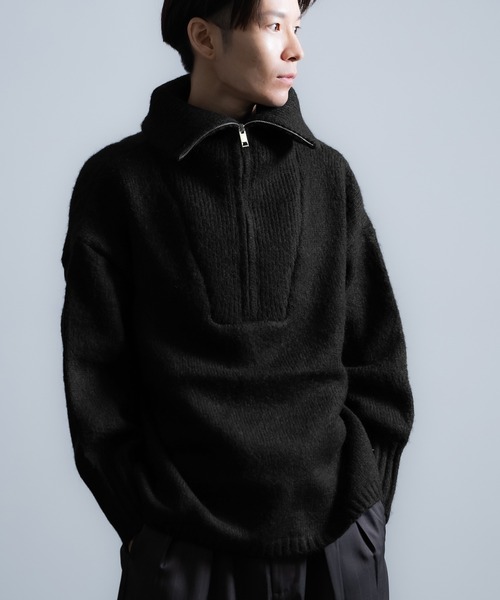 レイヤードスタイルで存在感を放つハーフジップセーター。 ●ウール高混率で非常に暖かく、モヘアタッチの柔らかい毛並み ●ウールの特性を活かしつつ、耐久性と軽さをプラス ●程よい肉厚感とトレンドのオーバーサイズシルエット ●レトロスポーティなディテールが人気のハーフジップデザイン 存在感のある大きな襟(ハイネック)と、リラックス感のあるビッグシルエットが魅力。 トレンドのワイドパンツやジョガーパンツと合わせるストリートカジュアルはもちろん、 きれいめなタック入りスラックスと合わせた大人カジュアルMIXもおすすめです。 アウターを着る際は、オーバーサイズのチェスターコートやダウンジャケットを合わせると、窮屈感なく今っぽいシルエットが完成します。 メンズはもちろん、レディースにもおすすめしたい一枚です。
