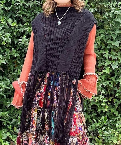 スタンドカラーで首元あたたかなフリンジ付きニットベスト。 斜めの柄編みがお洒落なレイヤードコーデに活躍するアイテム。 個性的なデザインでスタイルアップに◎ ※こちらの商品は1点1点職人による手作りとなります。その為、形や色合いなど若干異なる場合がございます。あらかじめご了承ください。 ※屋外での撮影画像は、光の当たり具合で色味・カラーが違って見える場合がございます。商品のカラーは、スタジオ撮影の画像をご参照ください。 Amina Collection Co.,LTD.