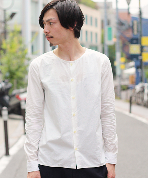Lui's(ルイス) Lui's(ルイス)オリジナルのノーカーシャツの入荷です。 ハリ感の強いタイプライター素材を使用したコチラのシャツ。 トレンドでもあるノーカラー仕様でありながらも、そのほかのデザインは極力シンプルにしどんなスタイリングにも相性の良いシャツとして仕上がっています。 衿がない分羽織り物のような印象でもスタイリングに使えるので、着用する方の着こなしの幅を広げてくれます。 これからのシーズンに合わせておすすめのシャツです!